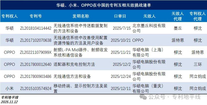 这一点,在三家公司于中国的专利无效纠纷中也能看出来,华硕有两件专利被发起了无效挑战,挑战者分别是OPPO和墨丘。华硕则对OPPO的三件专利发起了无效挑战,对小米的一件专利发起了无效挑战。